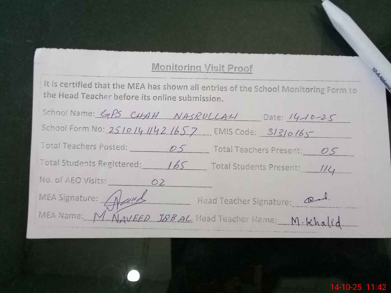 | Attendance Register | Head Teacher | MEA with School | Visit Proof |