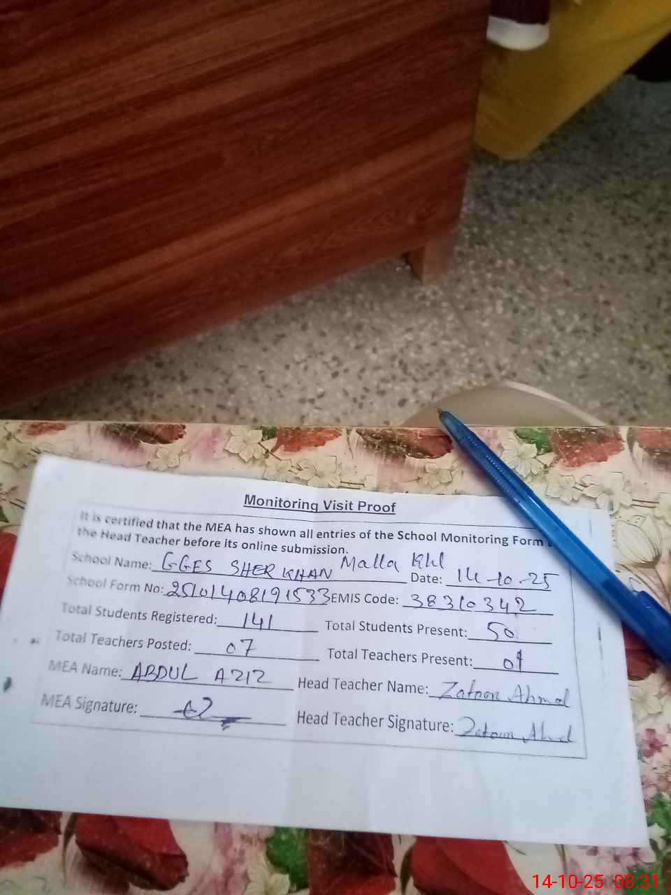 | Attendance Register | Head Teacher | MEA with School | Visit Proof |