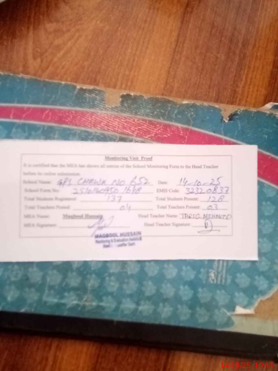 | EMIS Code: 32320837 | Name of School: GPS CHAK NO.652 TDA | |||