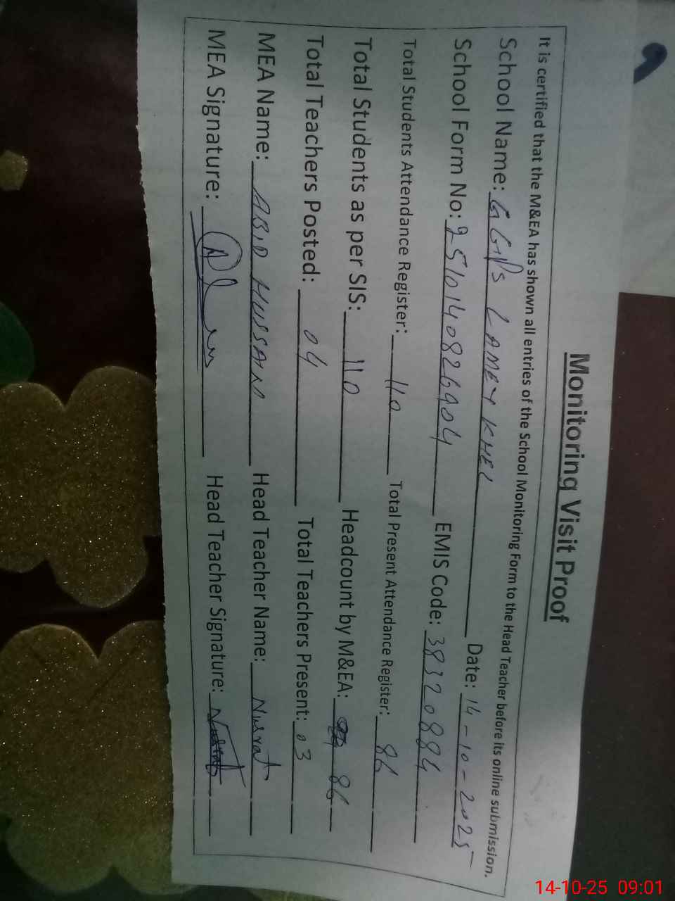 | Attendance Register | Head Teacher | MEA with School | Visit Proof |