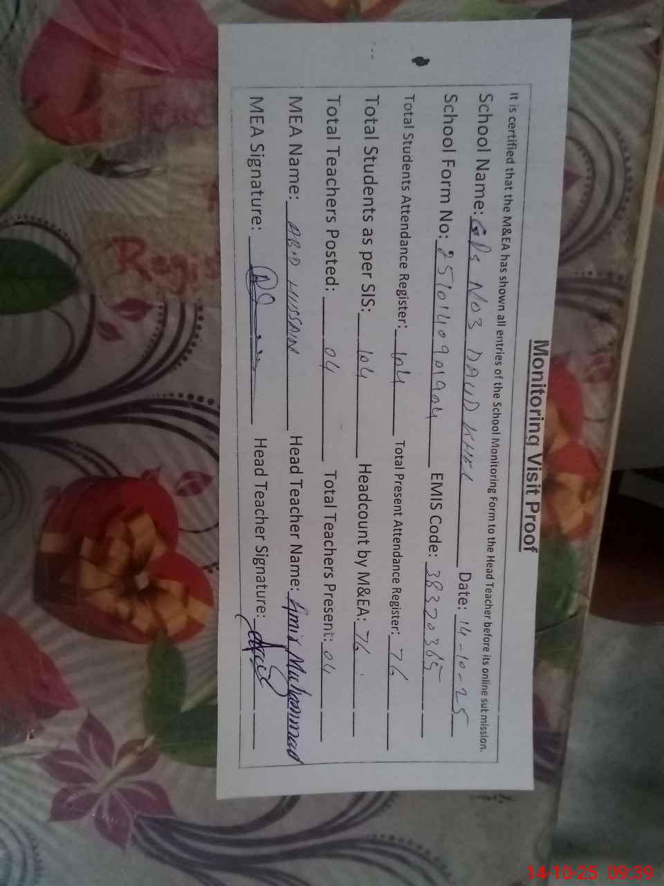 | EMIS Code: 38320365 | Name of School: GPS NO. 3 DAUD KHEL | |||