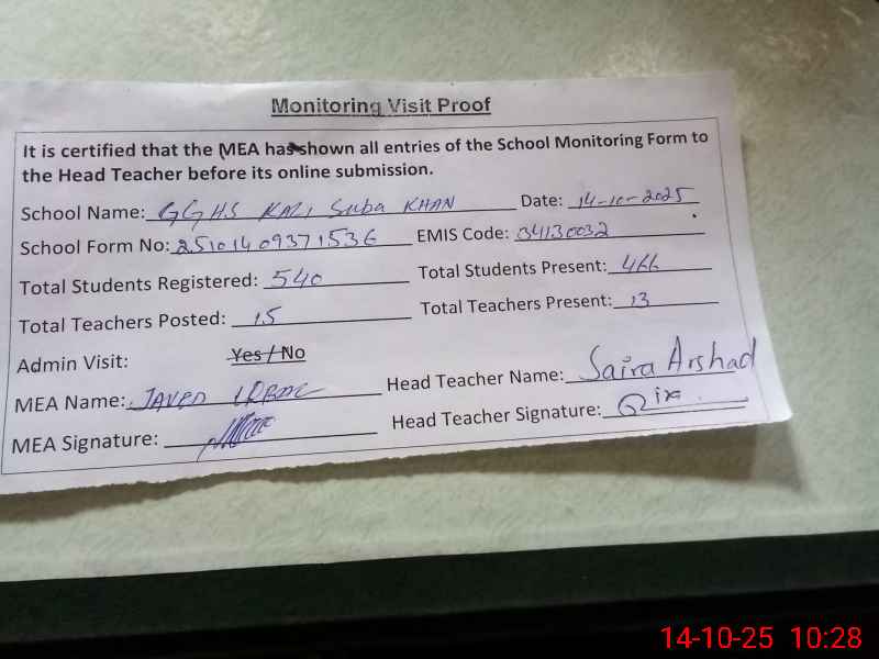 | EMIS Code: 34130032 | Name of School: GGHS KALI SUBA KHAN | |||