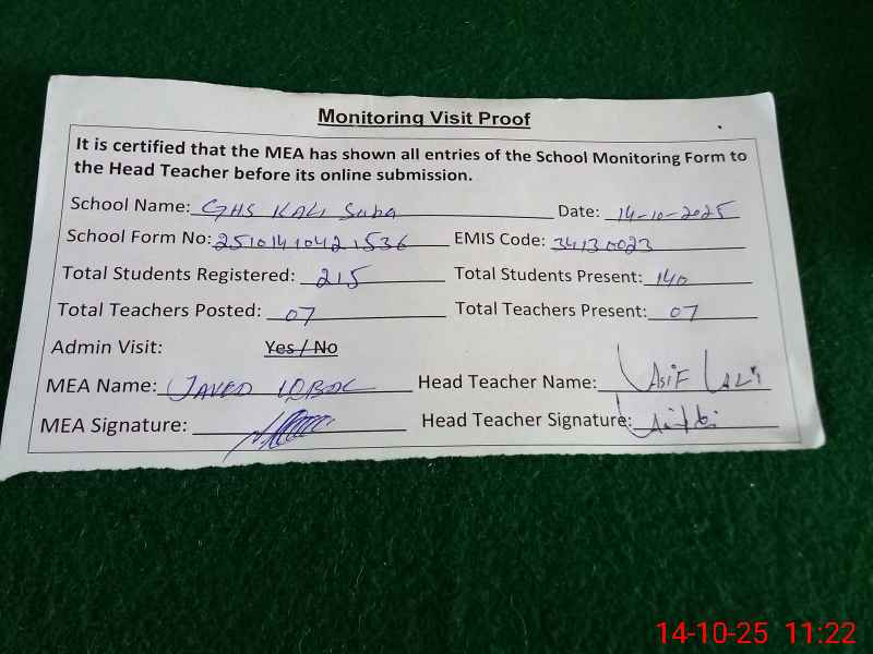 | EMIS Code: 34130023 | Name of School: GHS KALI SOBA KHAN | |||