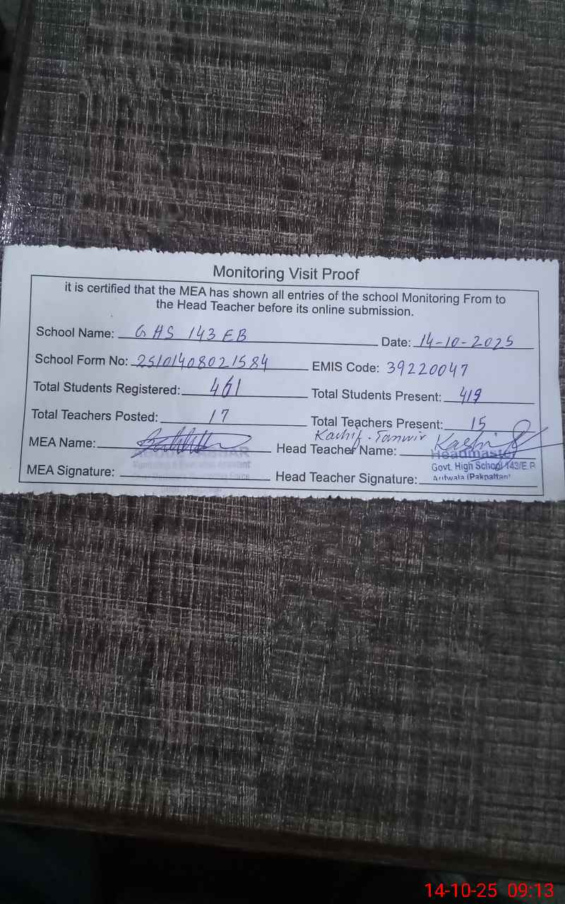 | EMIS Code: 39220047 | Name of School: GHS 143 EB PO 143 EB | |||