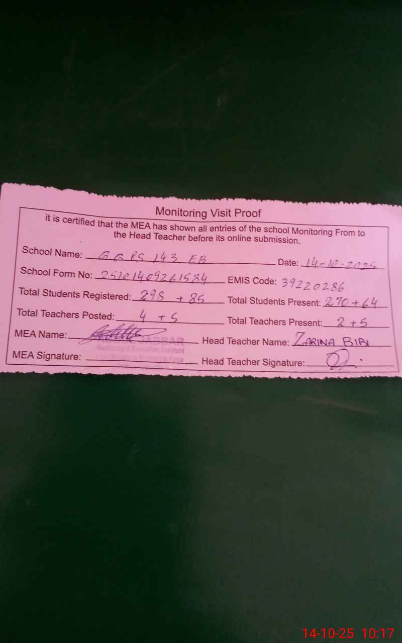 | EMIS Code: 39220286 | Name of School: GGPS 143 EB | |||