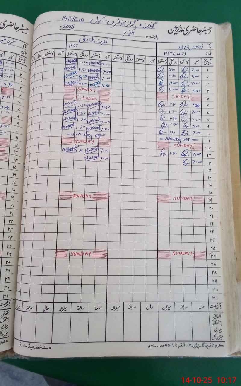 | CNIC | Full Name | Designation | R/C | Absence During Last Calender Month |