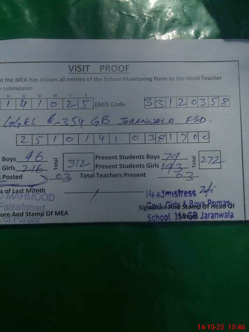 | EMIS Code: 33120358 | Name of School: GGES CHAK 354 GB JARANWALA | |||