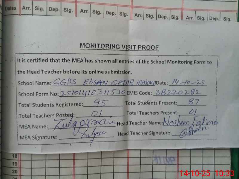 | EMIS Code: 38220282 | Name of School: GGPS EHSAN QADAR MAJOKA | |||