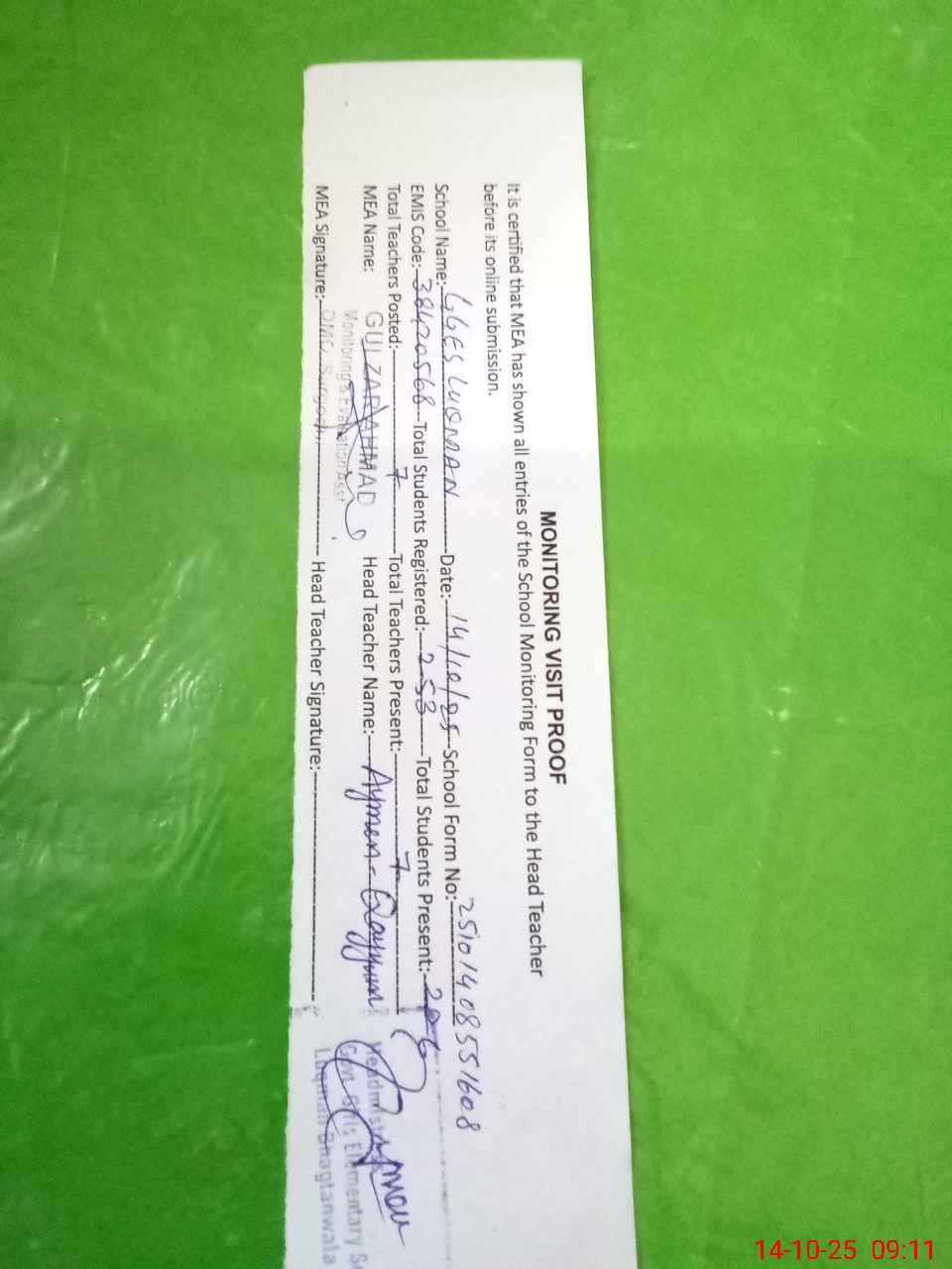 | Attendance Register | Head Teacher | MEA with School | Visit Proof |