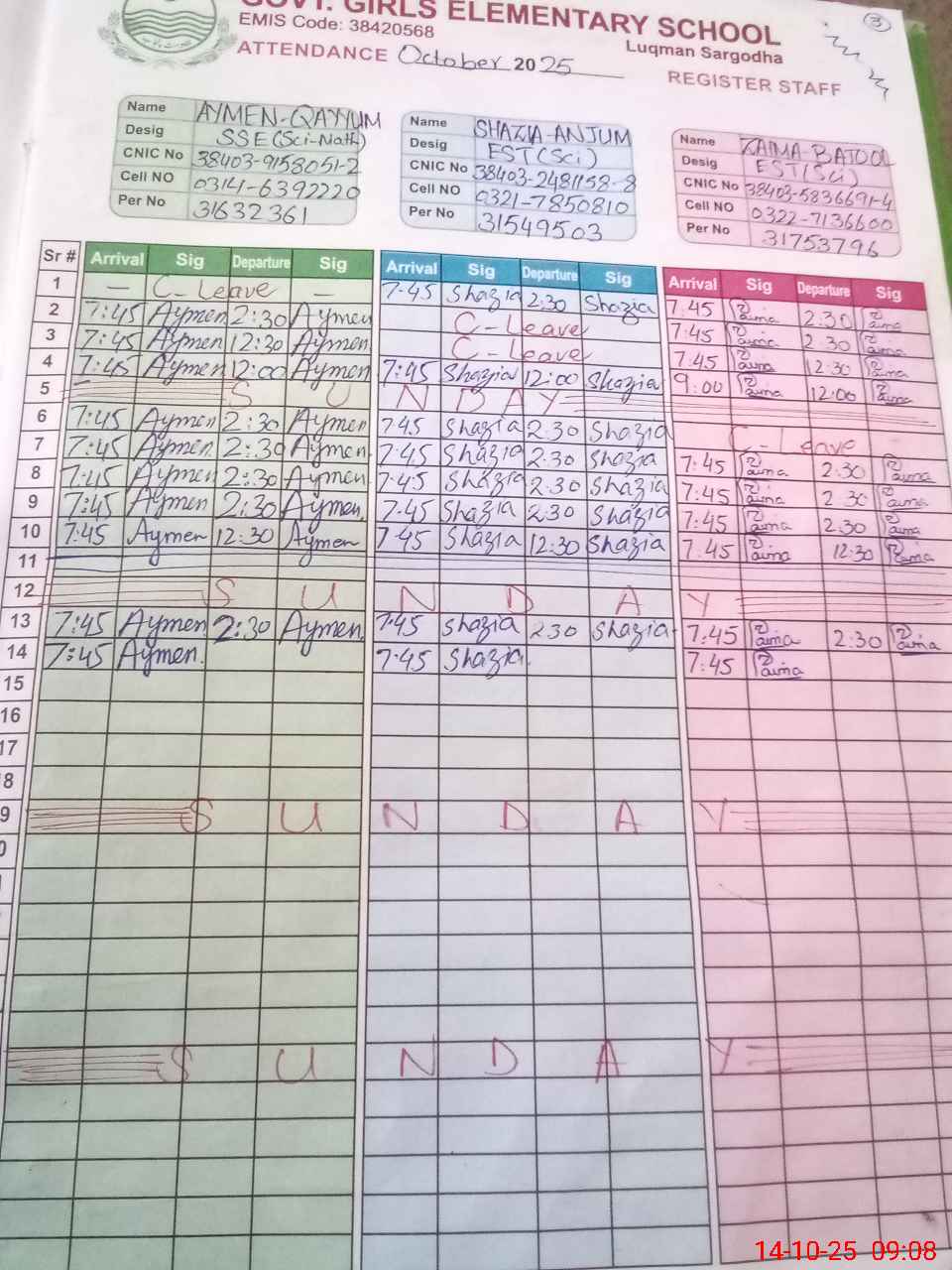 | CNIC | Full Name | Designation | R/C | Absence during last cal. month |