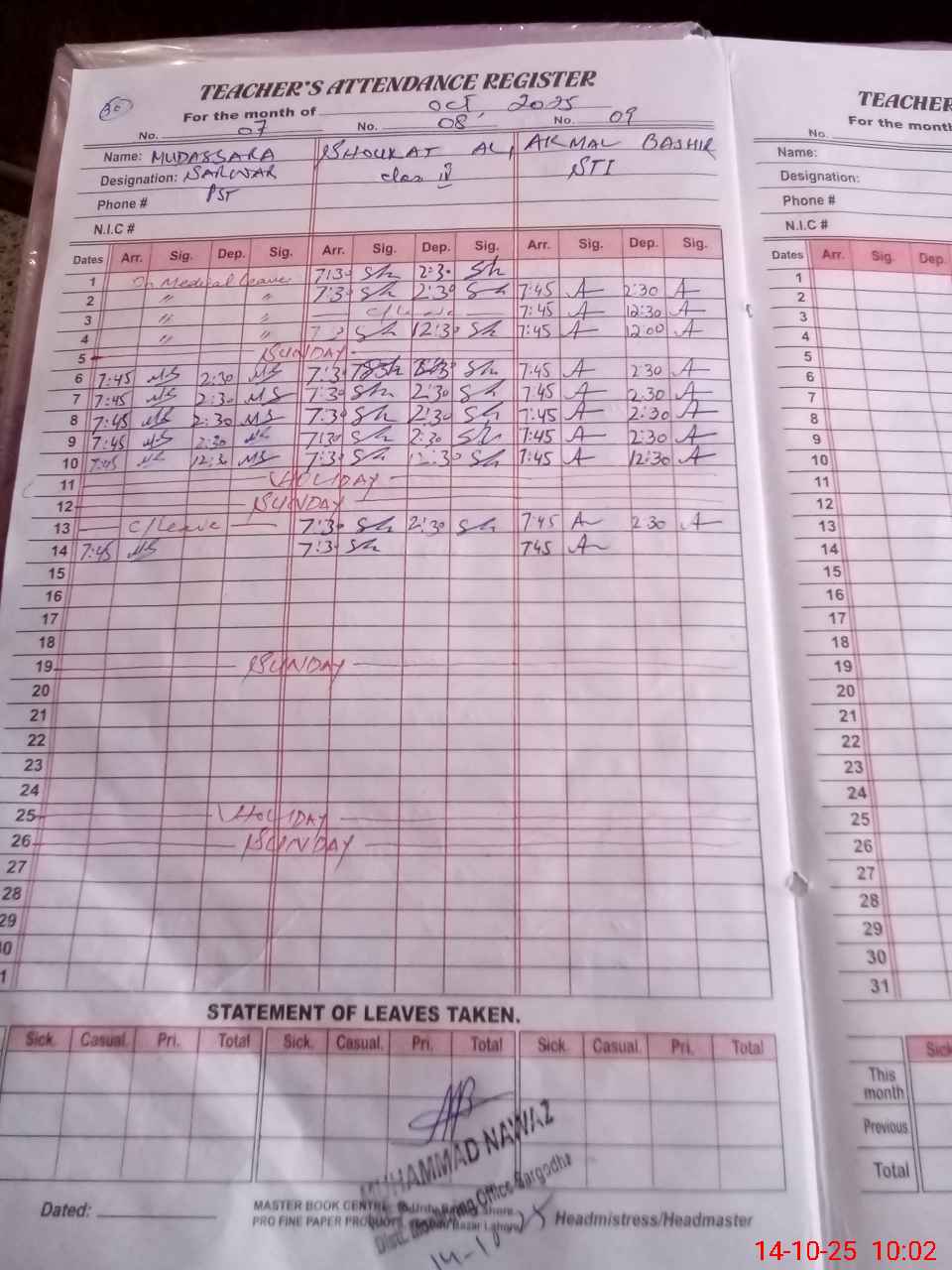 | CNIC | Full Name | Designation | R/C | Absence During Last Calender Month |
