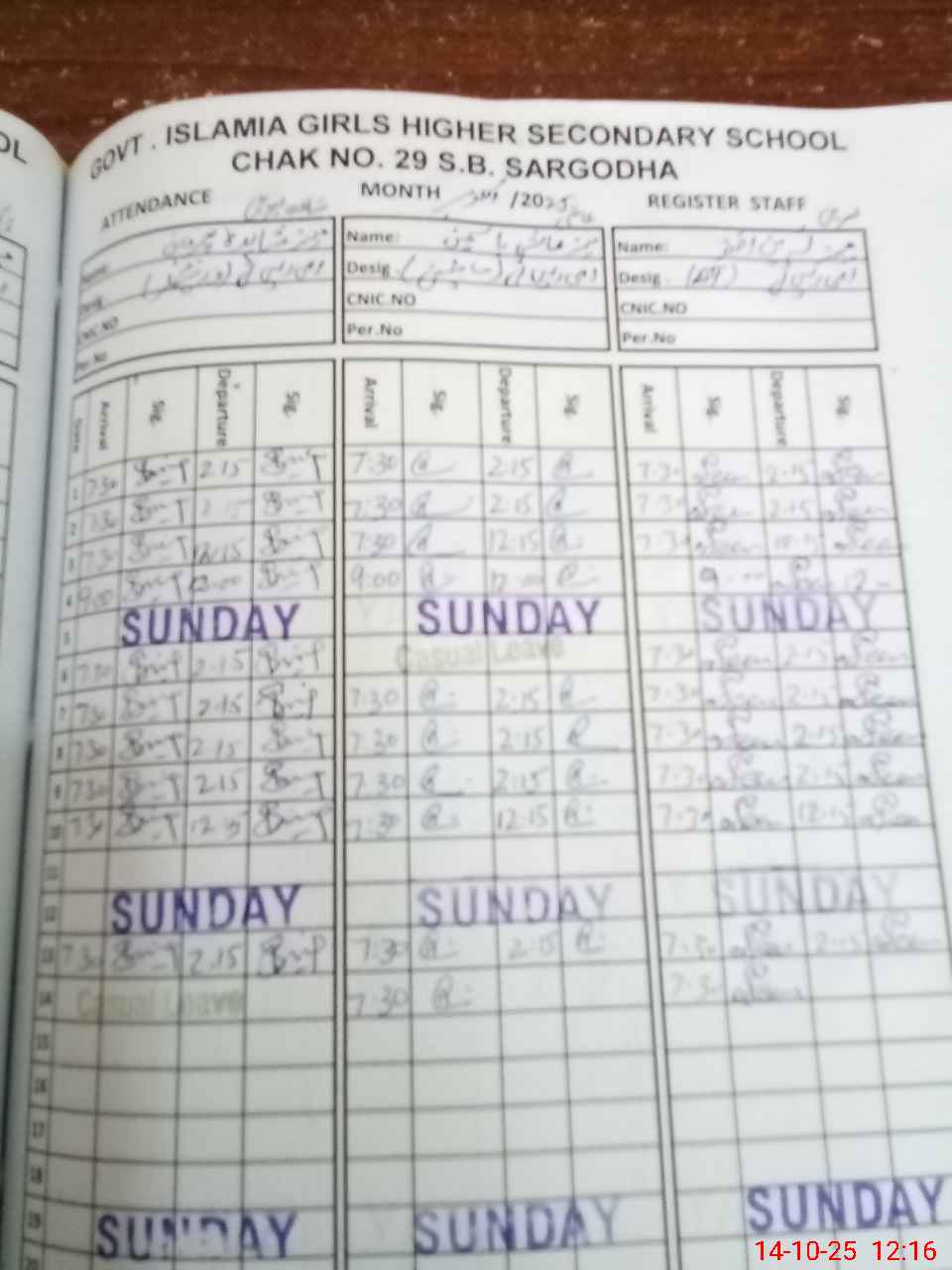 | CNIC | Full Name | Designation | R/C | Absence During Last Calender Month |