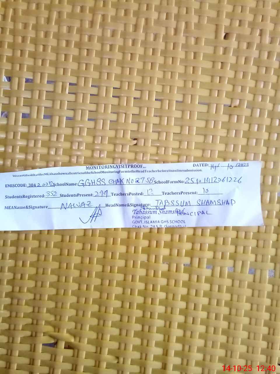 | Certified that this School was Inspected by the Undersigned MEA/DMO Today and the Information Stated Above is as Per Record. | |||||