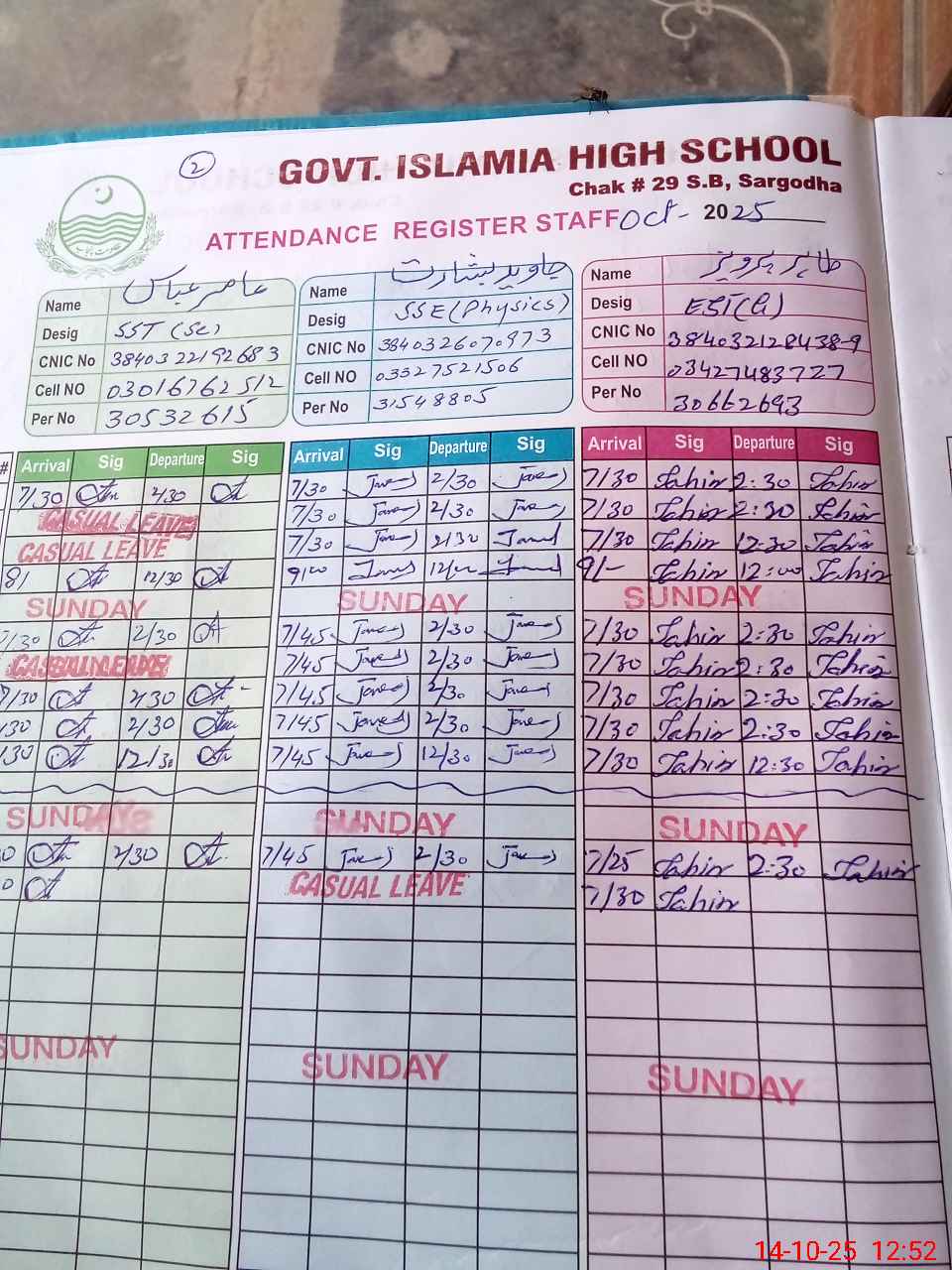 | CNIC | Full Name | Designation | R/C | Absence during last cal. month |
