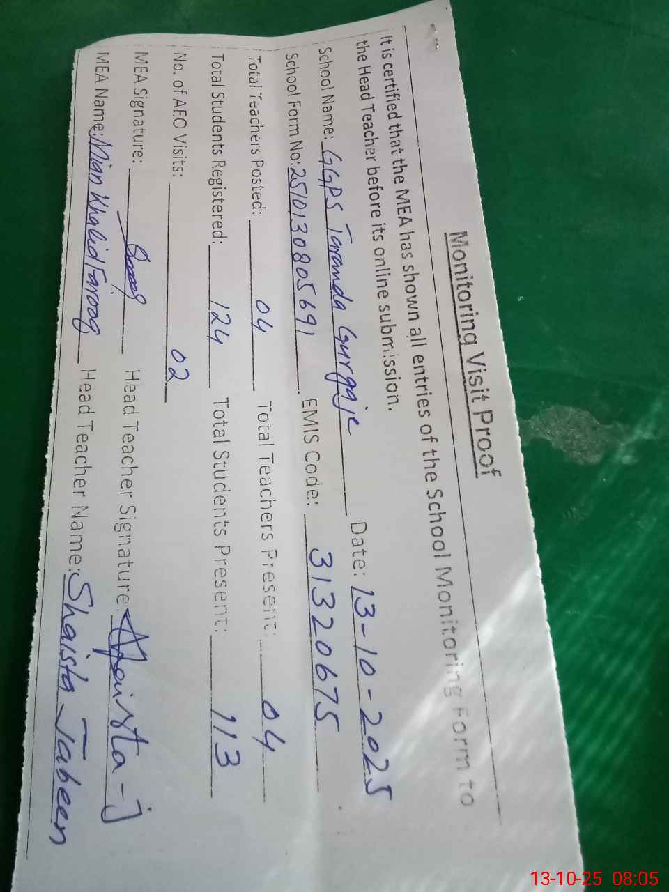 | Attendance Register | Head Teacher | MEA with School | Visit Proof |