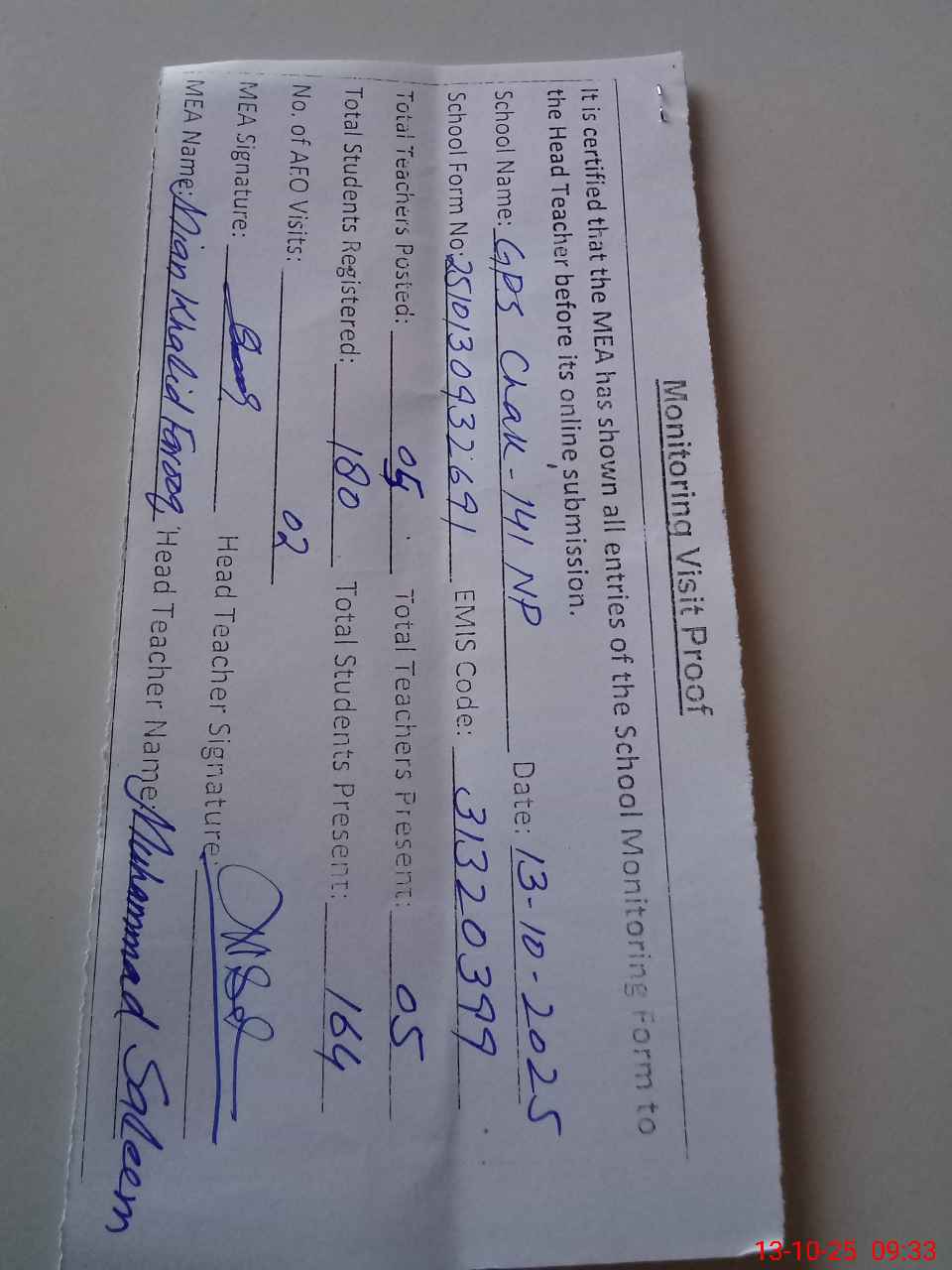 | Attendance Register | Head Teacher | MEA with School | Visit Proof |