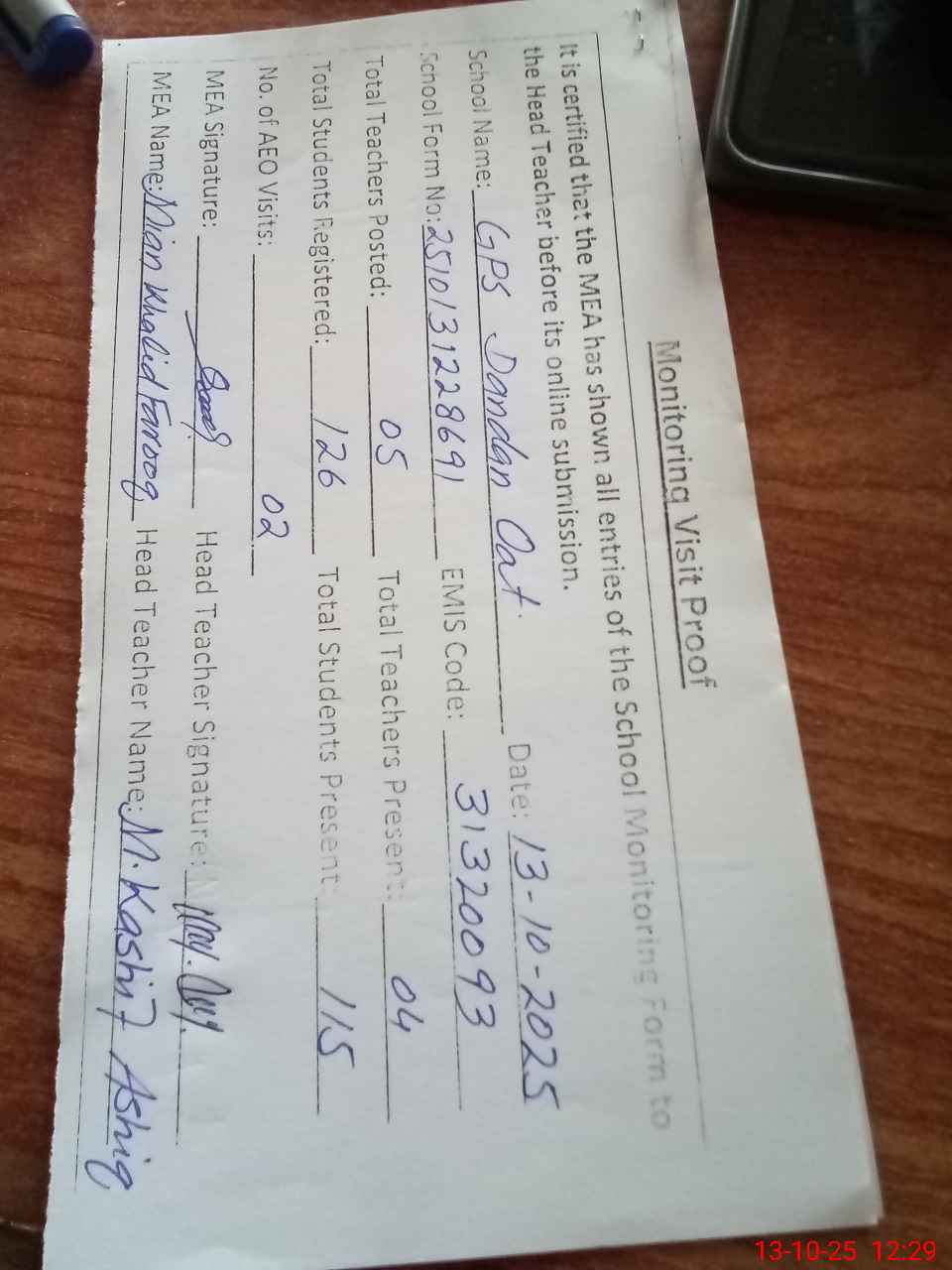 | Attendance Register | Head Teacher | MEA with School | Visit Proof |
