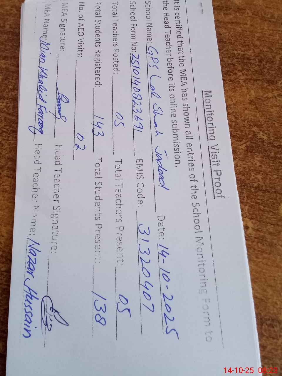 | Attendance Register | Head Teacher | MEA with School | Visit Proof |