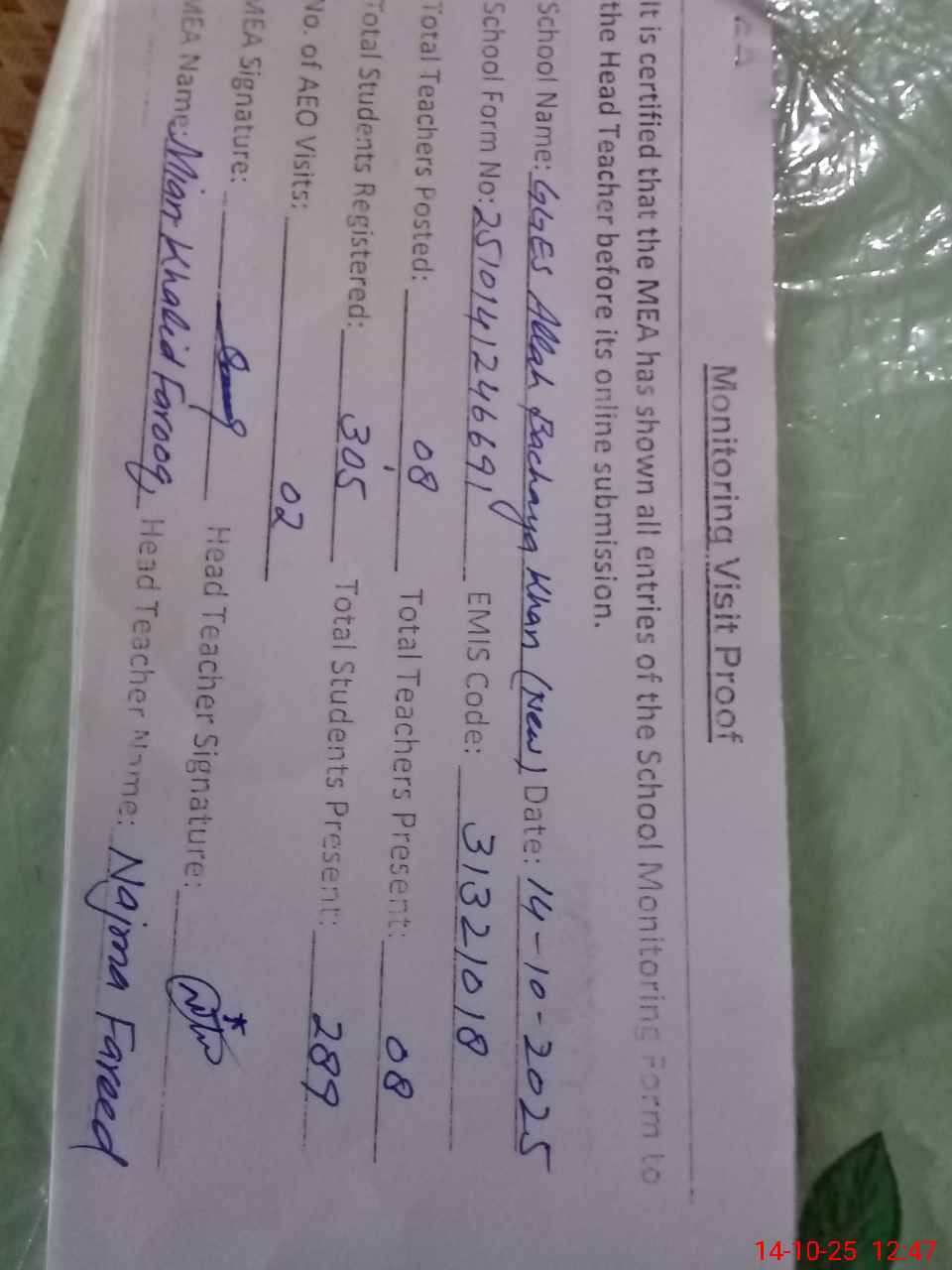 | EMIS Code: 31321018 | Name of School: GGES ALLAH BACHAYA KHAN | |||