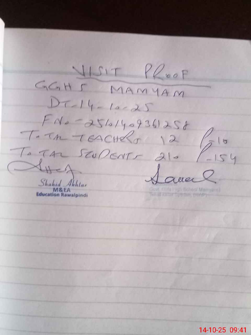 | Attendance Register | Head Teacher | MEA with School | Visit Proof |