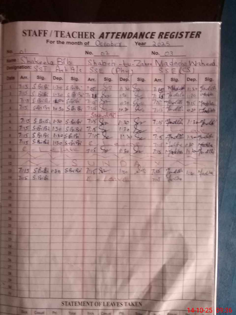| CNIC | Full Name | Designation | R/C | Absence During Last Calender Month |