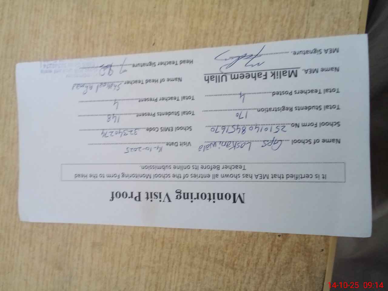 | Attendance Register | Head Teacher | MEA with School | Visit Proof |