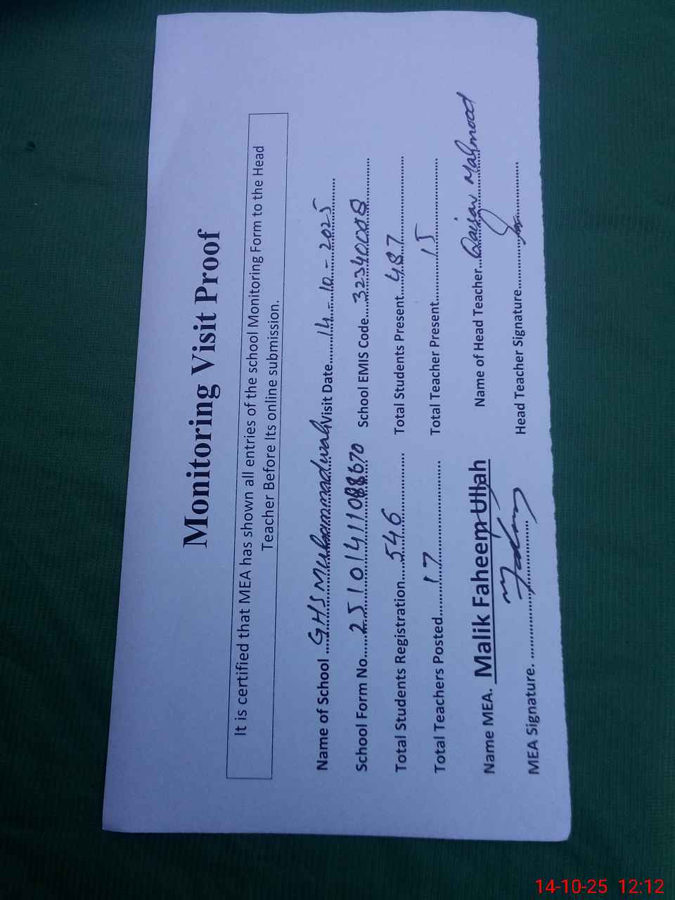 | Attendance Register | Head Teacher | MEA with School | Visit Proof |