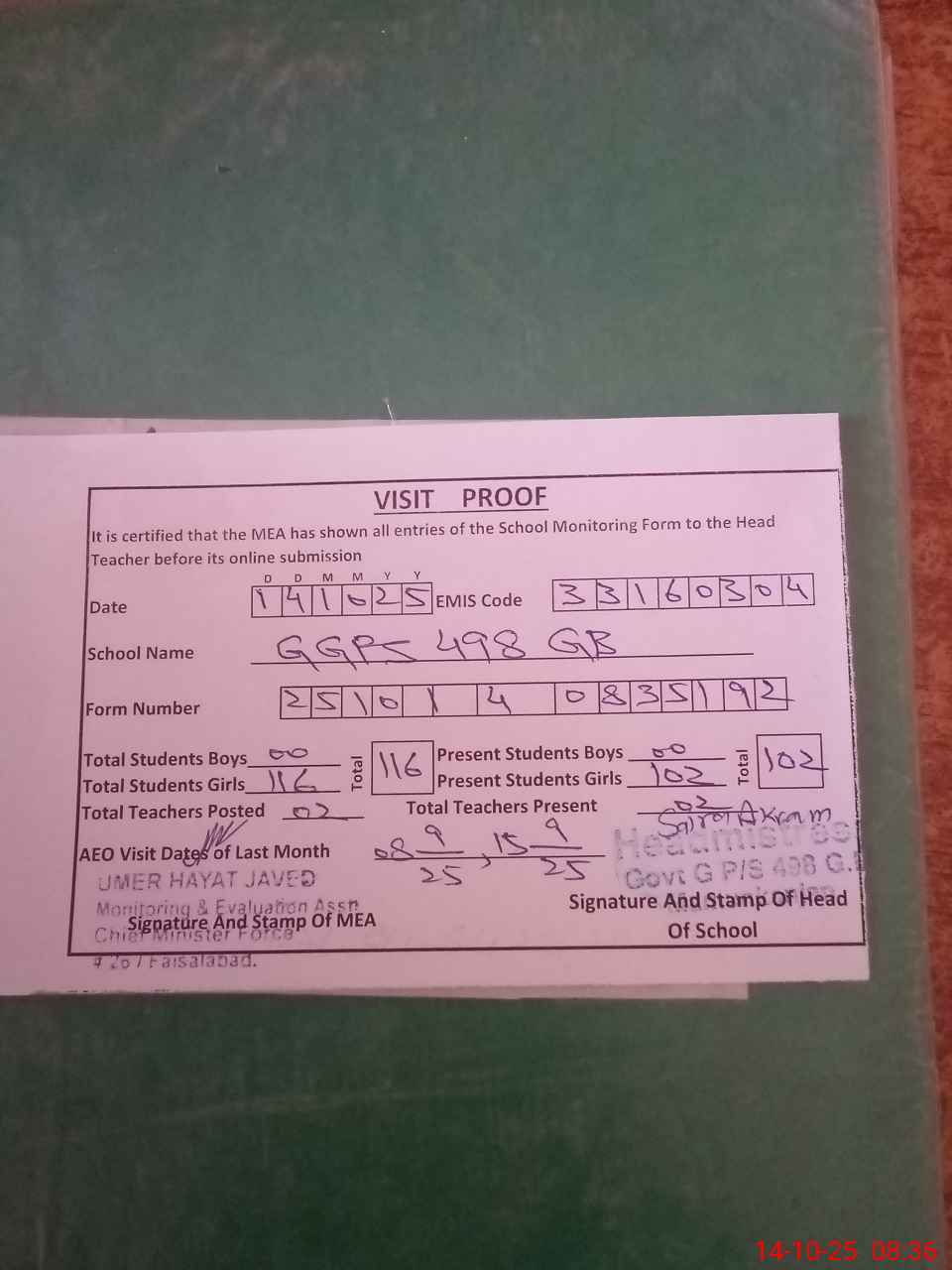 | Attendance Register | Head Teacher | MEA with School | Visit Proof |