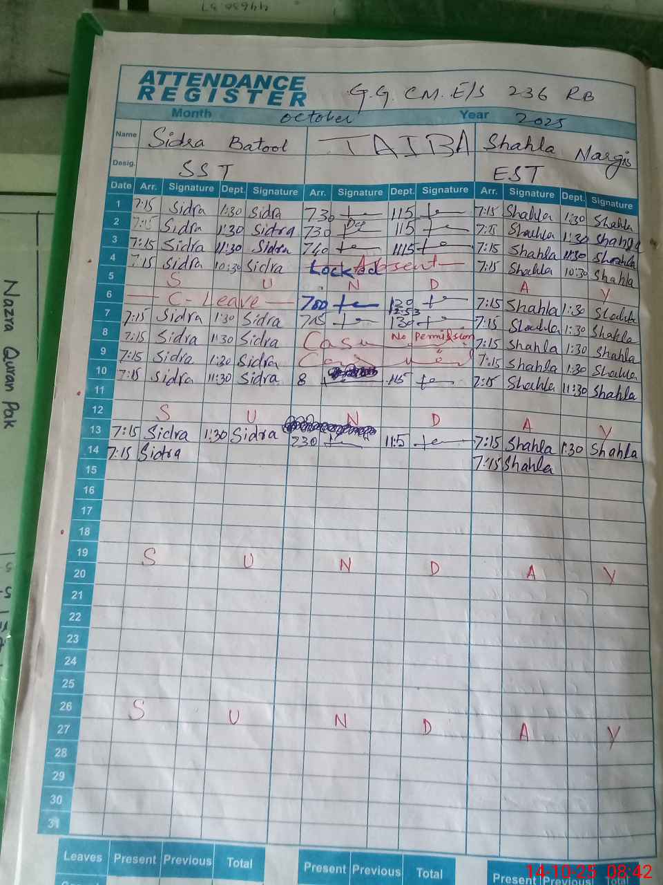 | 33**** | Sa**** Sa**** | 2 | 2 | 0 | 0 | 0 | 0 | 0 | 0 | 0 | 0 | 0 | Absent (Un-Authorized) |