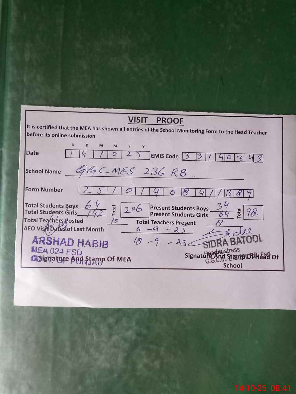 | EMIS Code: 33140343 | Name of School: GGCMES CHAK NO. 236 RB | |||