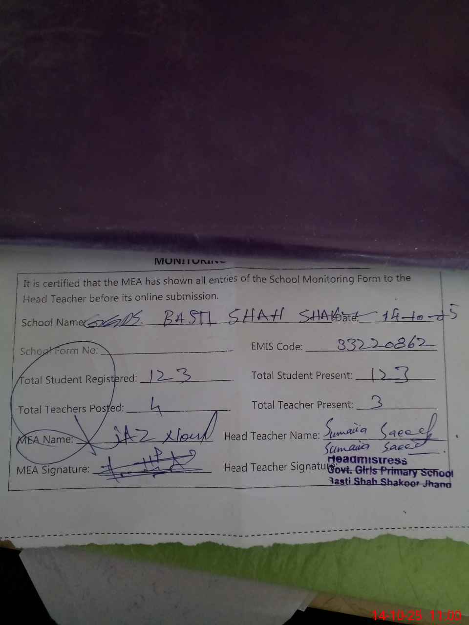 | Attendance Register | Head Teacher | MEA with School | Visit Proof |