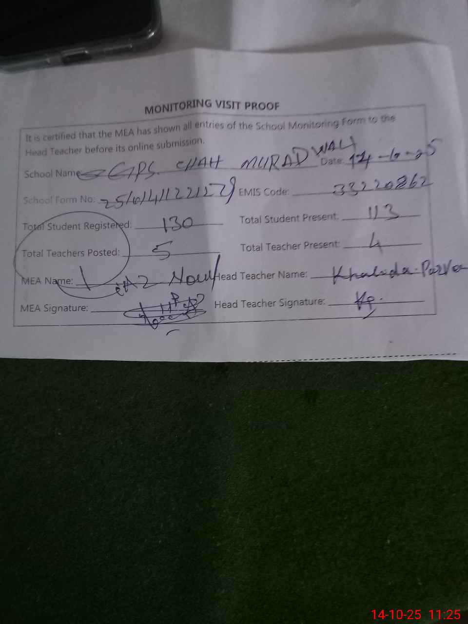 | Attendance Register | Head Teacher | MEA with School | Visit Proof |