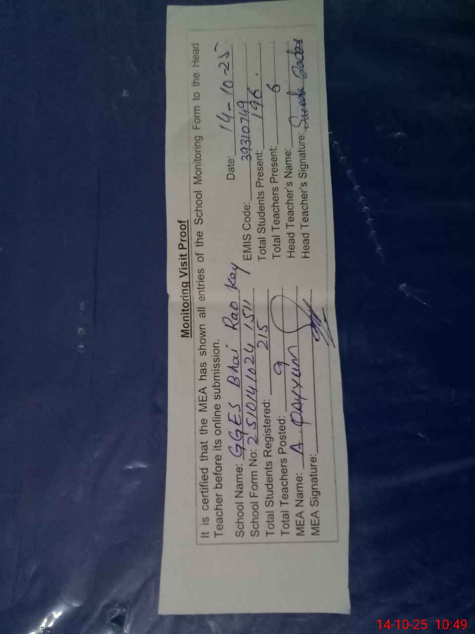 | Attendance Register | Head Teacher | MEA with School | Visit Proof |