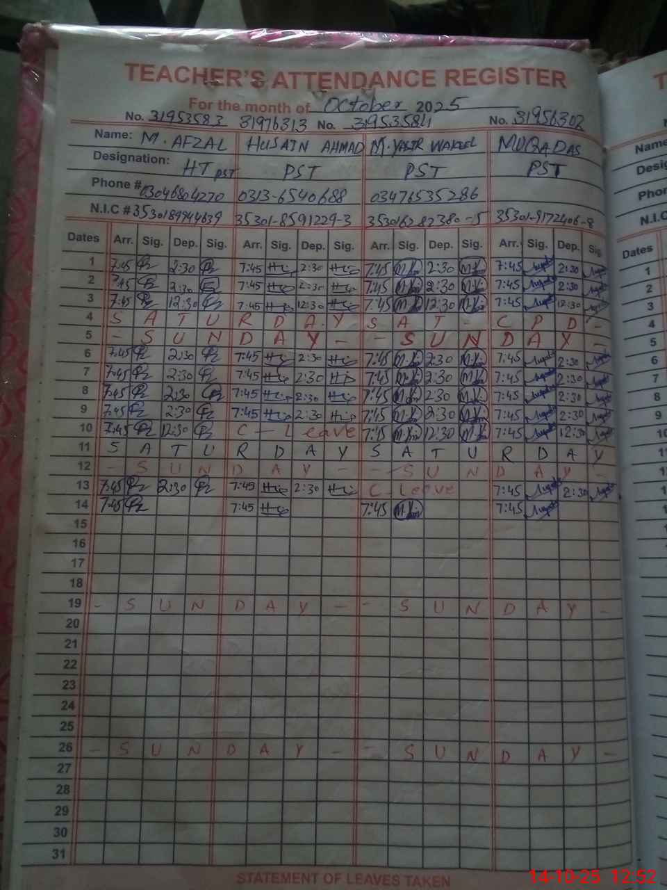 | CNIC | Full Name | Designation | R/C | Absence during last cal. month |