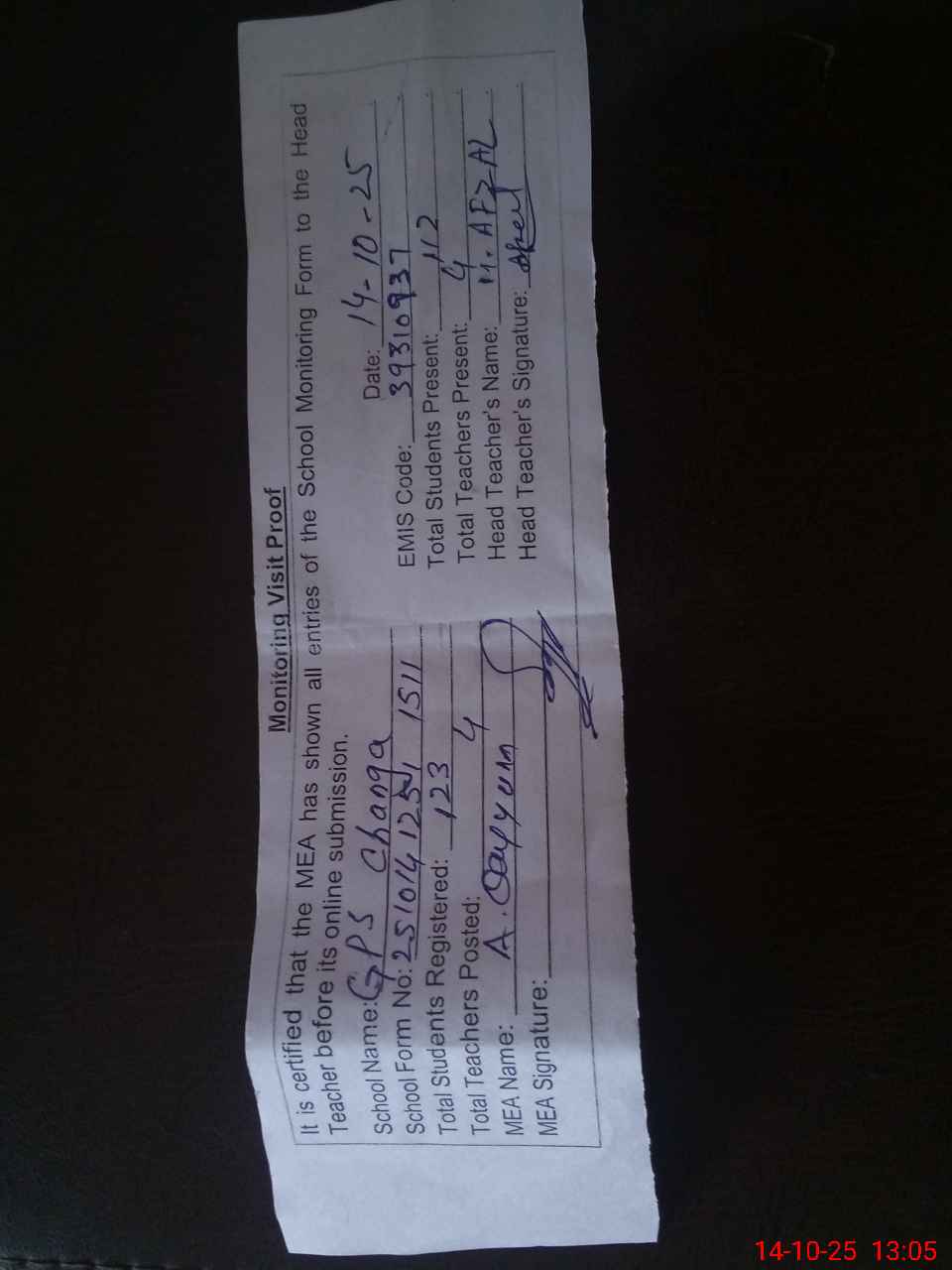 | Attendance Register | Head Teacher | MEA with School | Visit Proof |