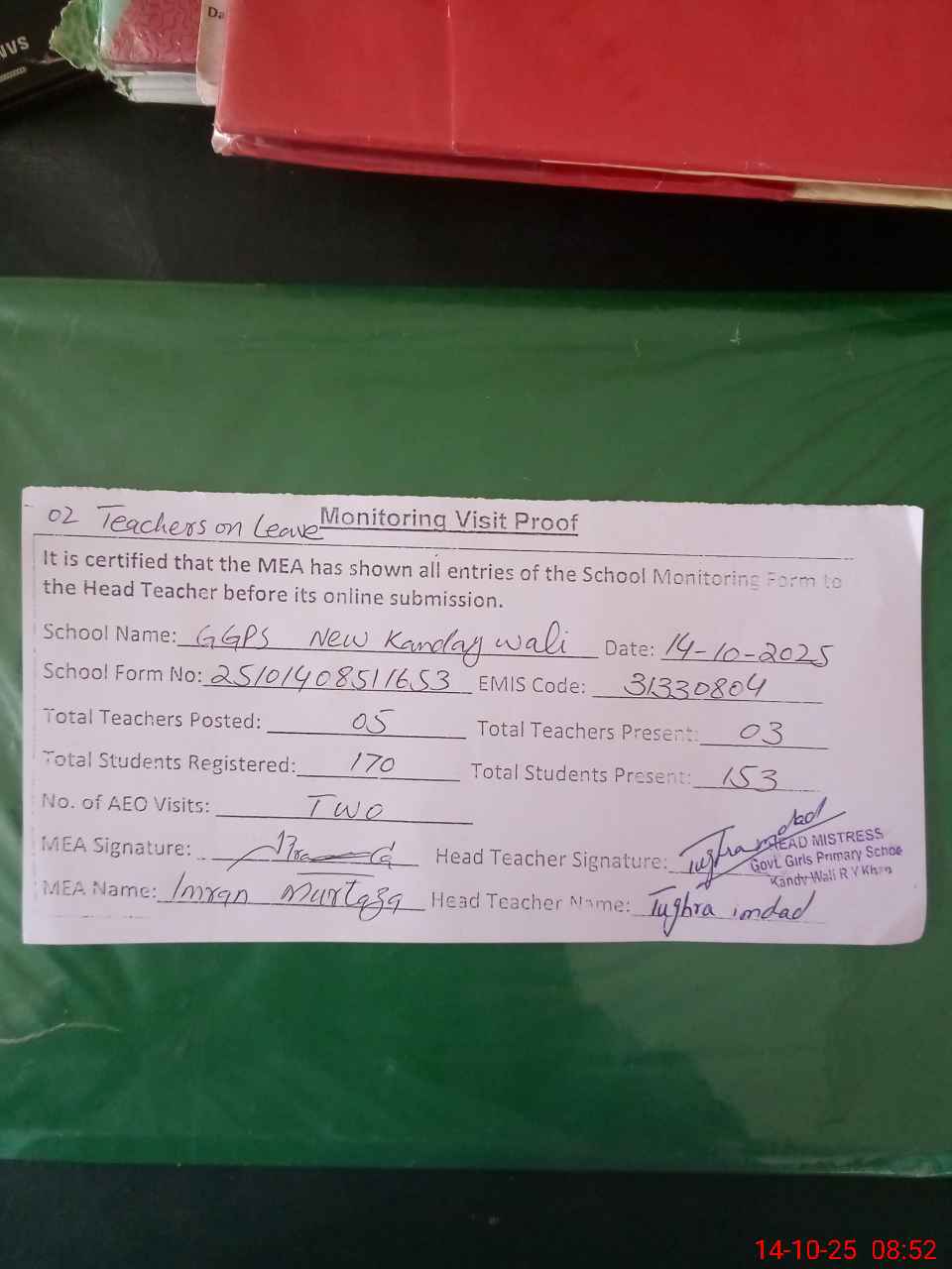 | Attendance Register | Head Teacher | MEA with School | Visit Proof |