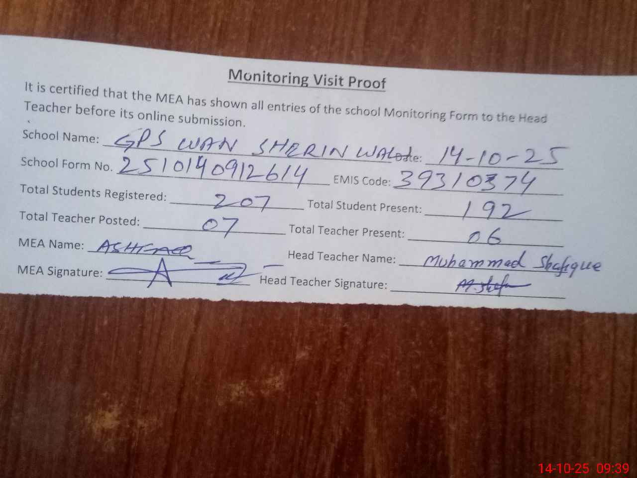 | EMIS Code: 39310374 | Name of School: GPS WAN SHERIN WALI | |||