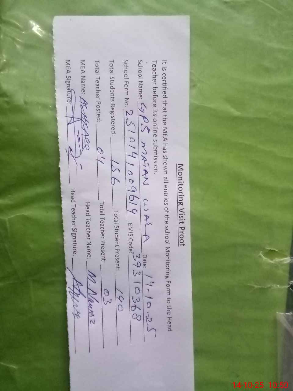 | EMIS Code: 39310368 | Name of School: GPS MATAN WALA | |||