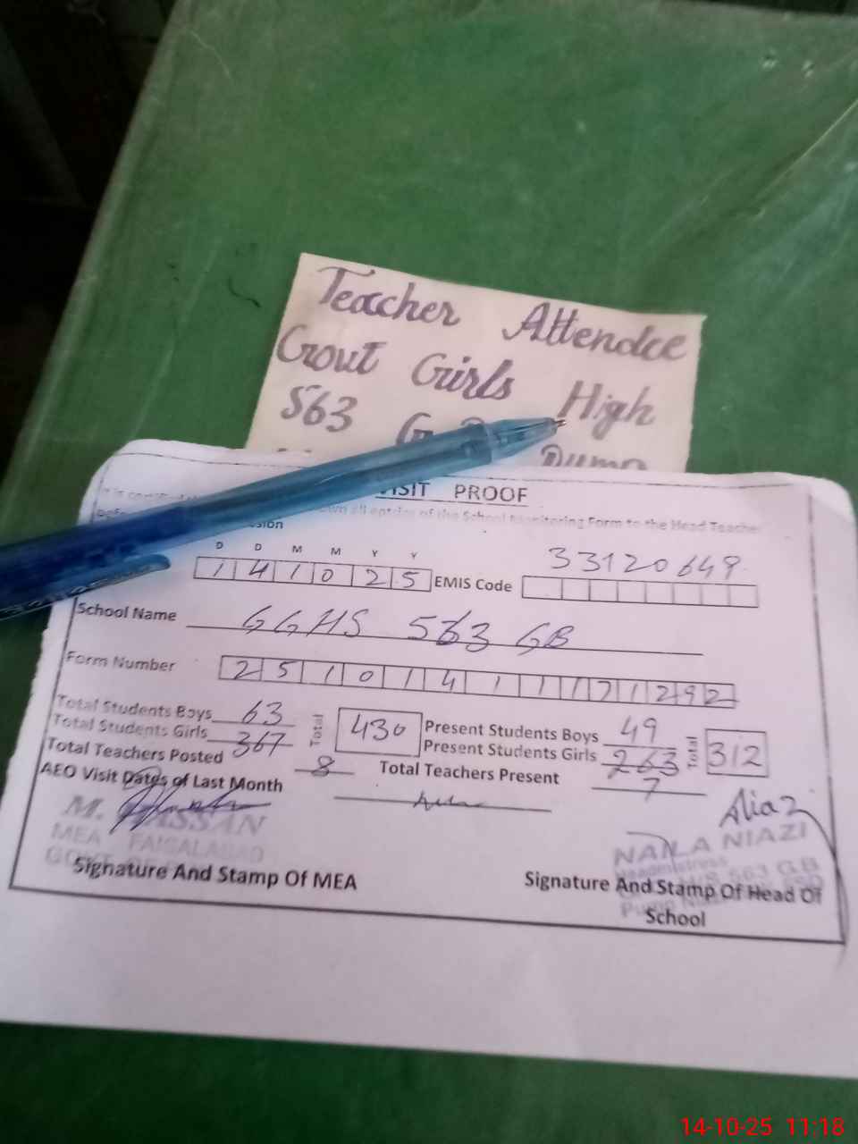 | Attendance Register | Head Teacher | MEA with School | Visit Proof |