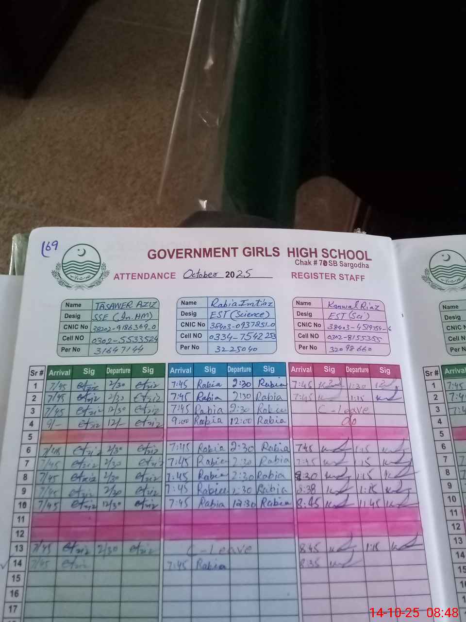 | CNIC | Full Name | Designation | R/C | Absence during last cal. month |