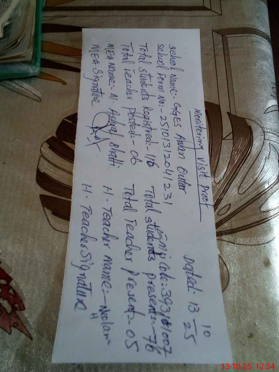 | Attendance Register | Head Teacher | MEA with School | Visit Proof |
