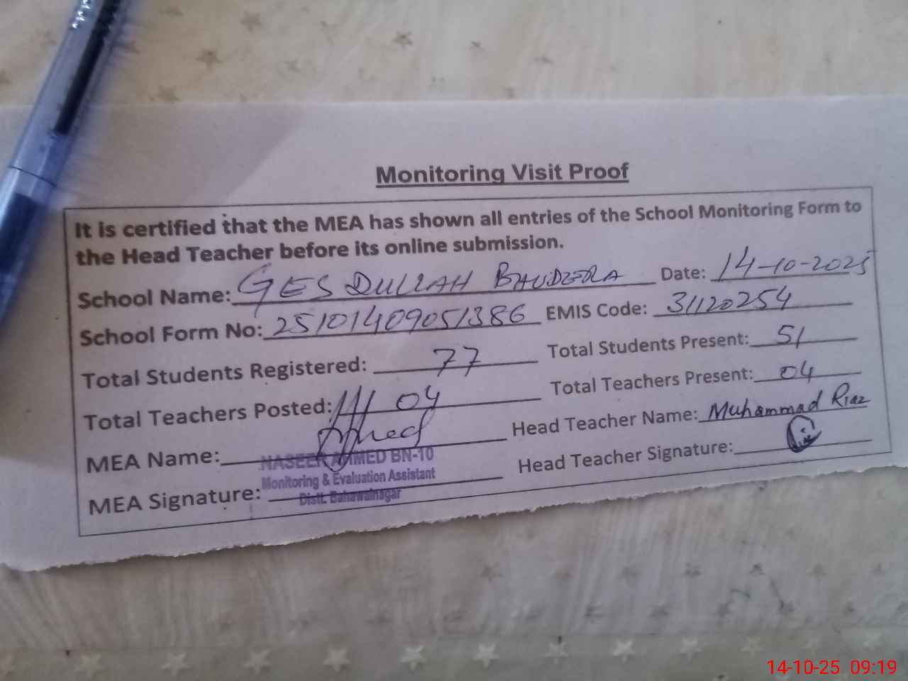 | Attendance Register | Head Teacher | MEA with School | Visit Proof |