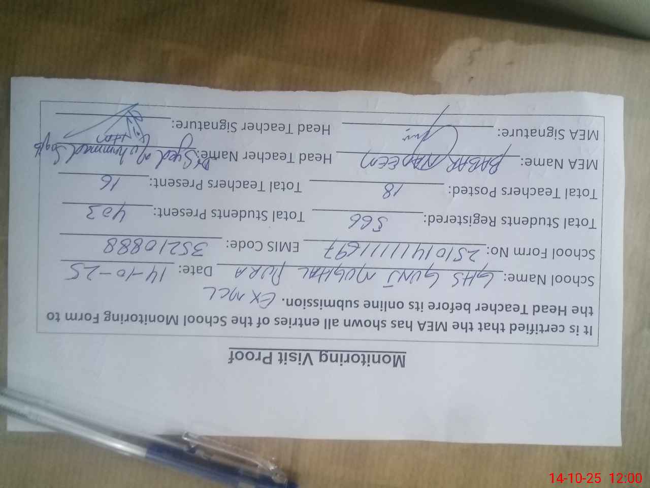 | Certified that this School was Inspected by the Undersigned MEA/DMO Today and the Information Stated Above is as Per Record. | |||||