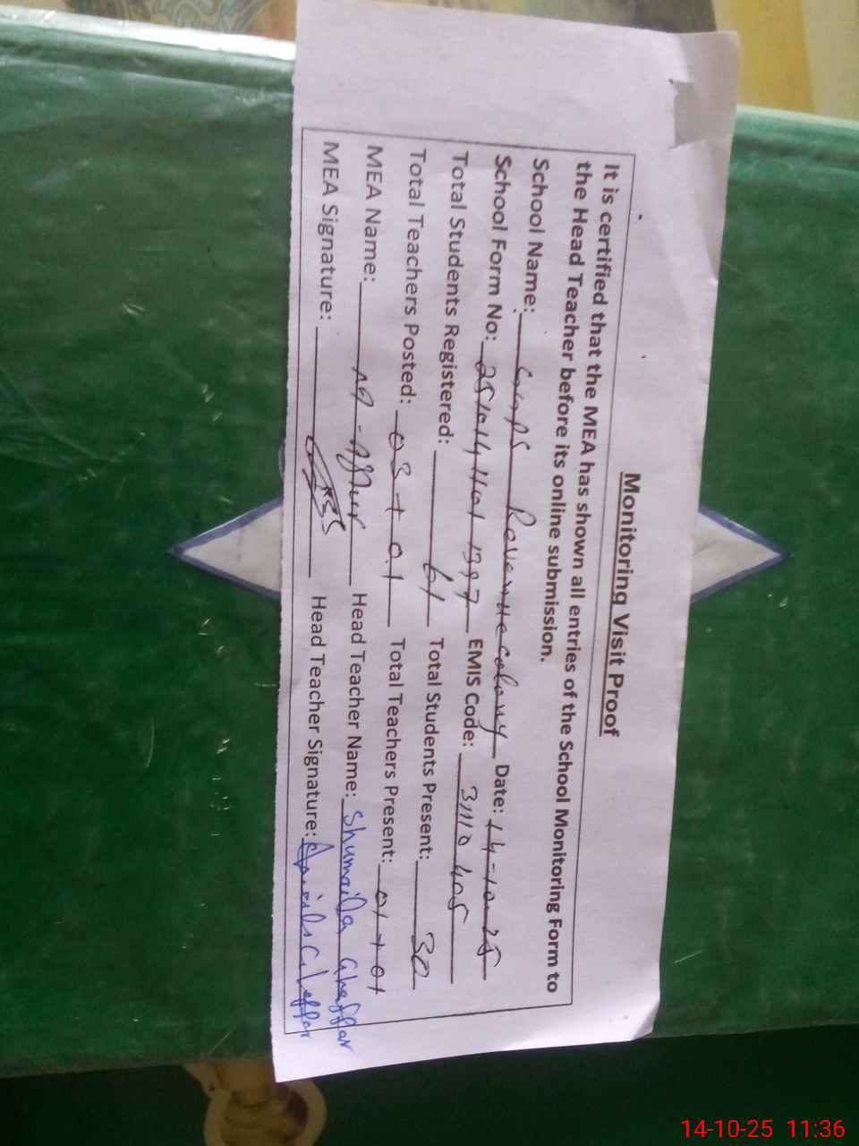 | Attendance Register | Head Teacher | MEA with School | Visit Proof |