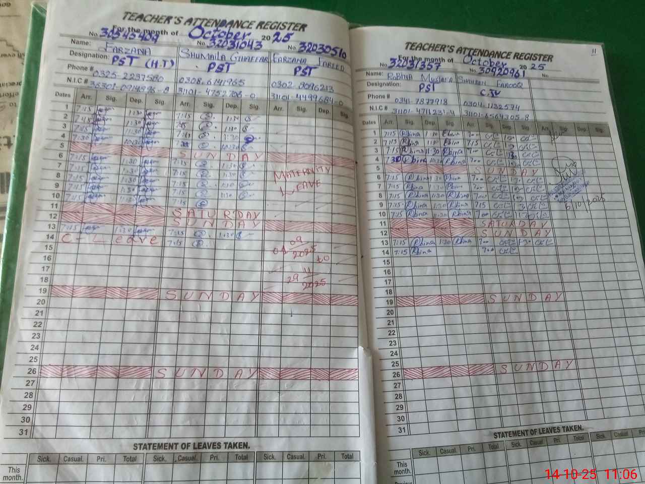 | CNIC | Full Name | Designation | R/C | Absence During Last Calender Month |