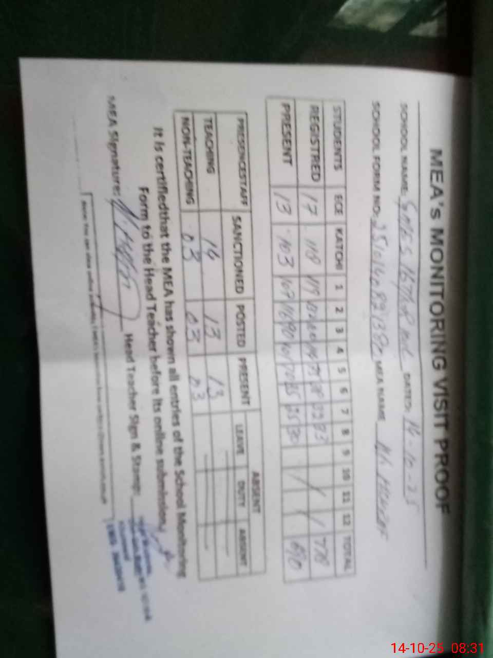 | Attendance Register | Head Teacher | MEA with School | Visit Proof |