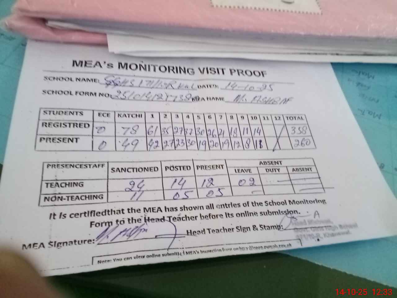 | Attendance Register | Head Teacher | MEA with School | Visit Proof |