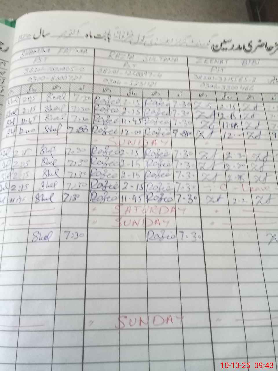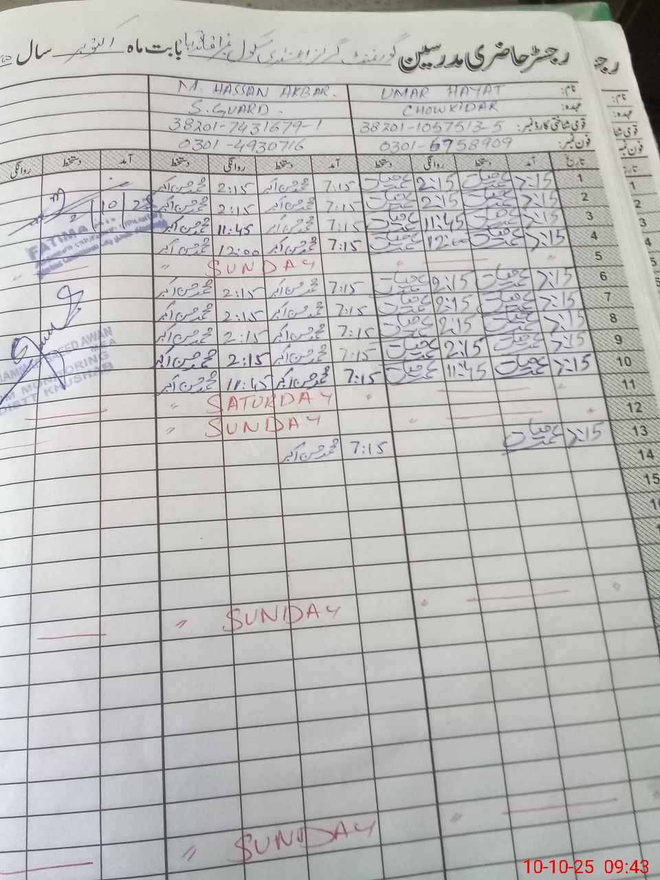 | CNIC | Full Name | Designation | R/C | Absence During Last Calender Month |