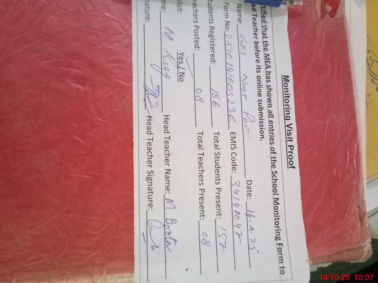 | Attendance Register | Head Teacher | MEA with School | Visit Proof |