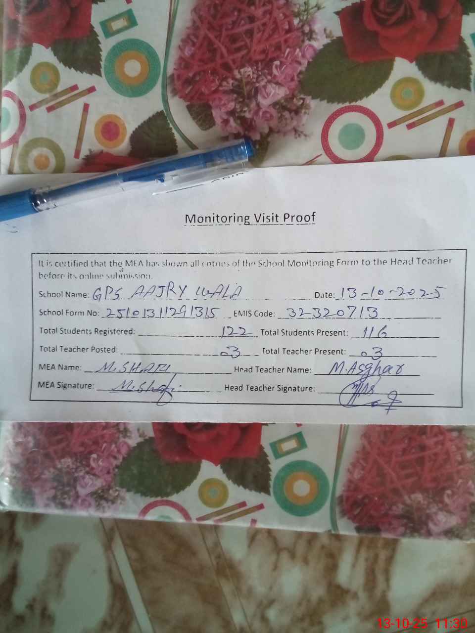 | EMIS Code: 32320713 | Name of School: GPS AAJRY WALA | |||